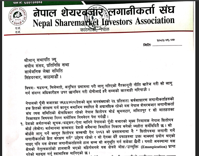काठमाण्डौ । नेपाल सेयर बजार लगानीकर्ता संघले नेपाल स्टक एक्सचेञ्ज लिमिटेड (नेप्से) र नेपाल धितोपत्र बोर्ड (सेबोन)को मिलेमतोमा लागू गरिएको नयाँ सर्किट ब्रेकर व्यवस्थाविरुद्ध संघीय संसदको सार्वजनिक लेखा समितिमा उजुरी दर्ता गरेको छ।