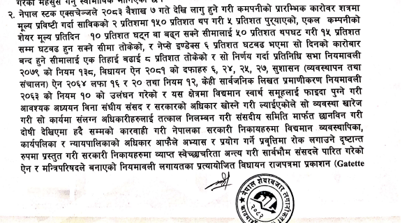 नेप्सेले आजबाट कम्पनी विशेषको सेयर कारोबारका क्रममा १० प्रतिशत मूल्य घटबढ हुँदा सर्किट लाग्ने व्यवस्था परिवर्तन गरी १५ प्रतिशत बनाएको छ । प्रिओपन सेसनमा मूल्यको सीमा तथा प्रत्येक कारोबारमा मूल्यको सीमा समेत बढाइएको छ । यी व्यवस्थाहरुको अन्य लगानीकर्ताहरुबाट पनि तीव्र आलोचना भइरहेको छ ।