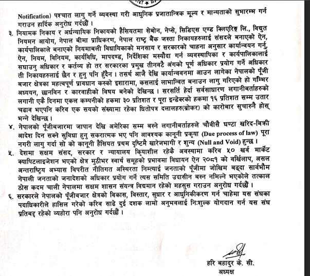 संघले नियामक निकायहरूबीचको समन्वय र पारदर्शितामाथि प्रश्न उठाउँदै पूँजी बजारमा विश्वास संकट सिर्जना हुने खतरा औंल्याएको छ। साथै, तत्काल स्वतन्त्र छानबिन समिति गठन गरी दोषीमाथि कारबाही गर्नुपर्ने माग राखिएको छ।