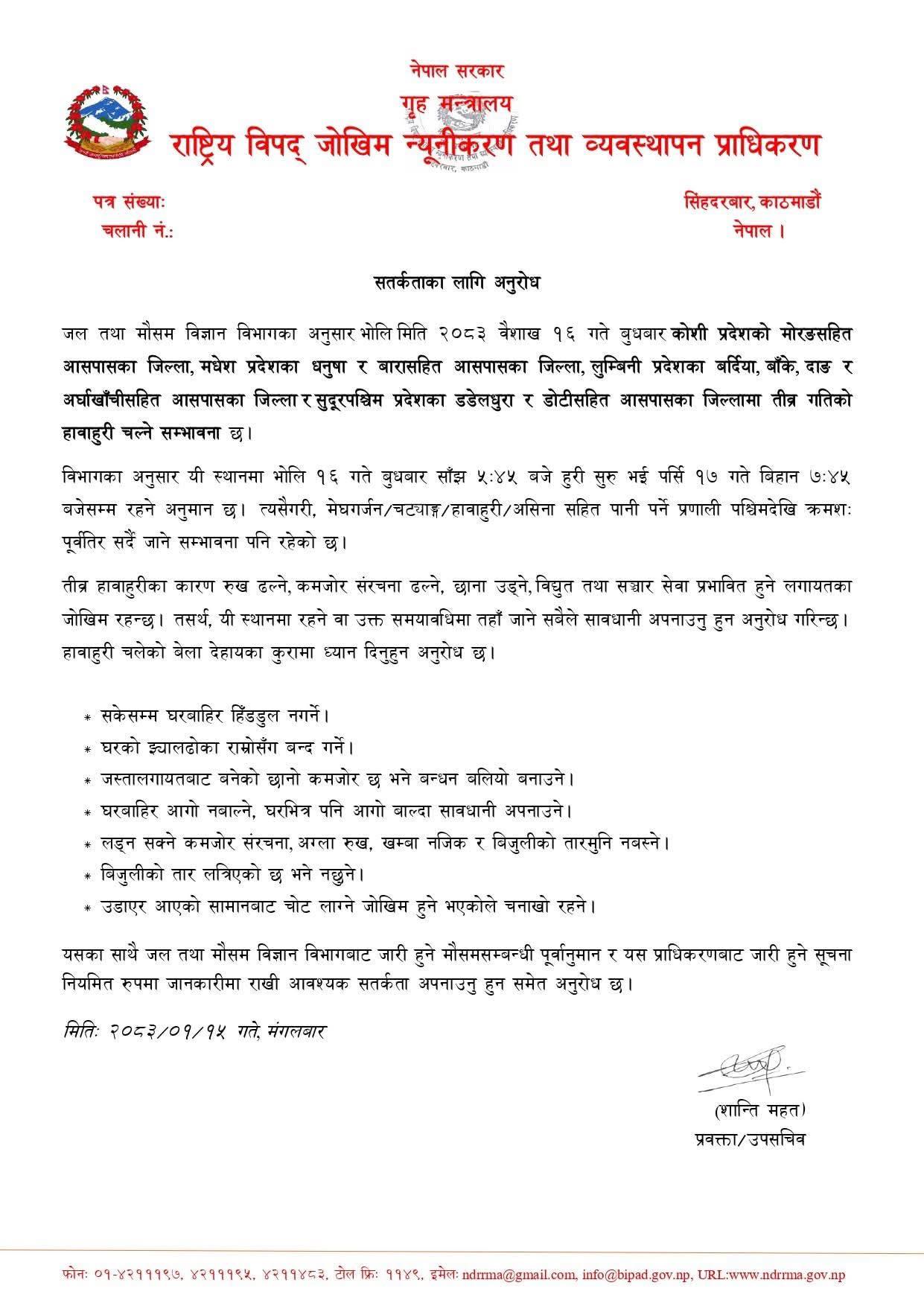 साथै, मौसमसम्बन्धी अद्यावधिक सूचना नियमित रूपमा पछ्याउन र आवश्यक सतर्कता अपनाउन प्राधिकरणले सबैमा अनुरोध गरेको छ।