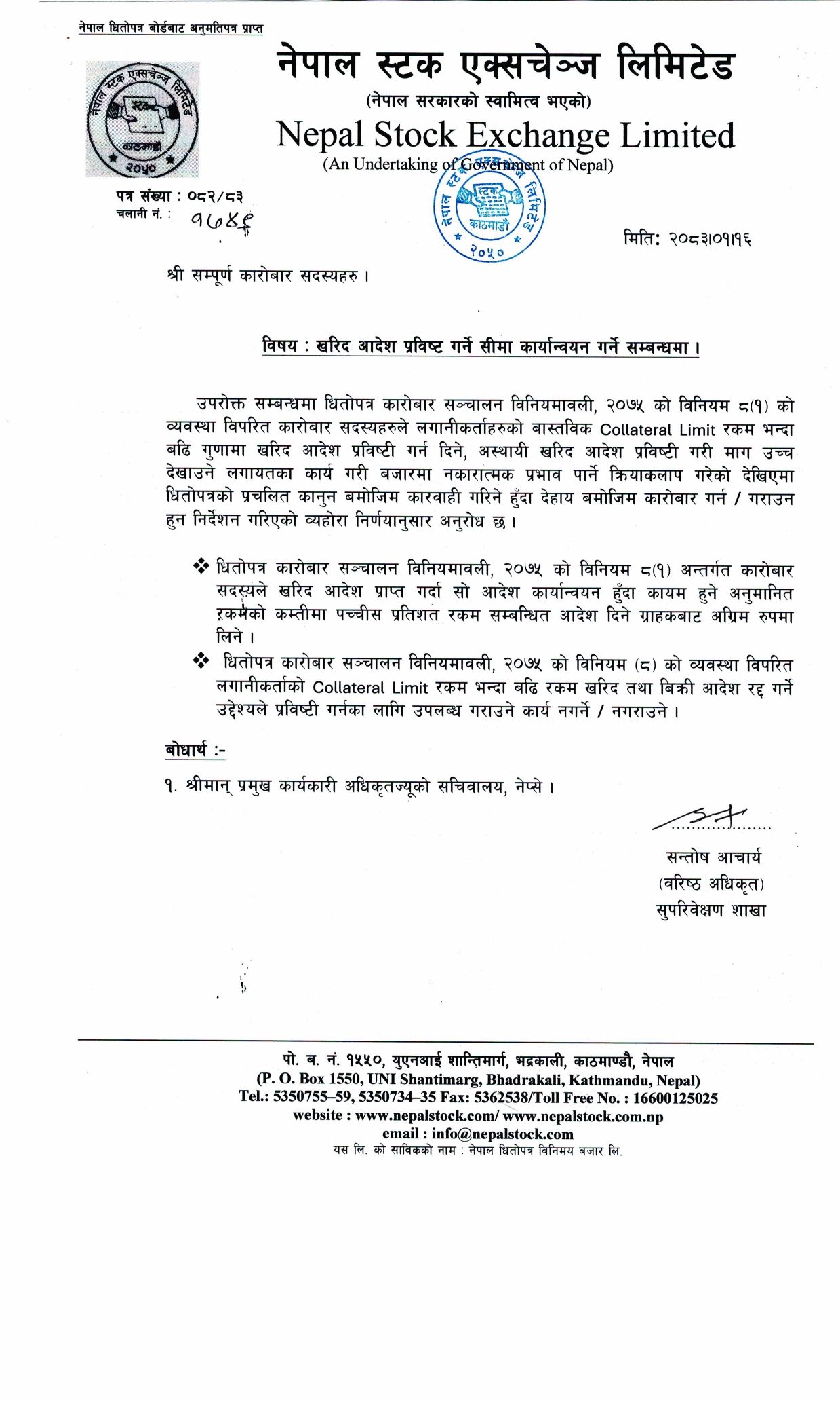कारोबार सदस्यहरुलाई बुधबार एक लिखित निर्देशन गर्दै सुपरीवेक्षण शाखाले लगानीकर्ताहरुको वास्तविक कोल्याटरल लिमीट रकमभन्दा बढी गुणामा खरीद आदेश प्रविष्ट गर्न दिने, अस्थायी खरीद आदेश प्रविष्ट गरी माग उच्च देखाउने लगायतका कार्य नगर्न र हुन नदिन भनेको हो । यस्ता कार्य गरी बजारमा नकारात्मक क्रियाकलाप गरेको देखिएमा धितोपत्रको प्रचलित कानूनबमोजिम कारबाही हुने चेतावनी दिइएको छ ।