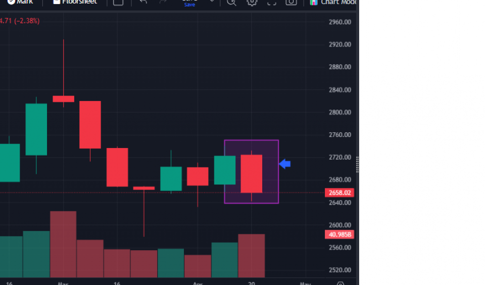 साप्ताहिक रुपमा यो साताको बजारलाई नियाल्दा नेप्सेको चार्टमा ‘बियरिस इन्गल्फिङ प्याटर्न’ बनेको छ । यदि अघिल्लो हरियो क्याण्डललाई पछिल्लो रातो क्याण्डलले पूरै ढाक्छ भने त्यसलाई बियरिस इन्गल्फिङ प्यार्टन भनिन्छ । यसले घट्दो बजारलाई संकेत गर्छ । यस विपरित यदि अघिल्लो रातो क्याण्डलाई पछिल्लो हरियो क्याण्डलले पूरै ढाक्छ भने त्यसलाई बुलिस इन्गल्फिङ भनिन्छ । यसले बढ्दो बजारलाई संकेत गर्छ । यस हिसाबले यो साता नेप्सेको चार्टमा बियरिस प्रकृतिको प्यार्टन बनेको छ ।