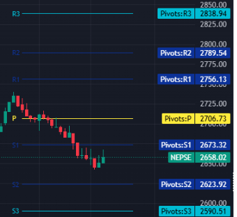 निष्कर्षः यो साता सेयर बजारमा करिब ६५ अंकले गिरावट आयो । अघिल्लो साता बजार ५२ अंकले बढेको थियो । प्राविधिक रुपमा हालको बजारले ५० दिने मुभिङ एभरेजमा प्रतिरोध सामना गरेको छ भने २०० दिने मुभिङ एभरेजमा सपोर्ट लिएको छ । यो साता बजार घट्दा कारोबार र भोल्युम भने बढेको छ । क्याण्डल स्टिकबाट नियाल्दा बियरिस इन्गल्फिङ प्याटर्न बनेको छ । यो साता बजार साप्ताहिक पिभट् प्वइन्ट २७०६ भन्दा तल खसेको छ । यस हिसाबले अब बजारले क्रमशः पहिलो, दोस्रो तथा तेस्रो विन्दुमा सपोर्ट लिन सक्छ । क्षेत्रगत रुपमा नियाल्दा यो साता म्युचुअल फण्ड र उत्पादन समूह बाहेक सबै समूहमा रातो पोतियो ।