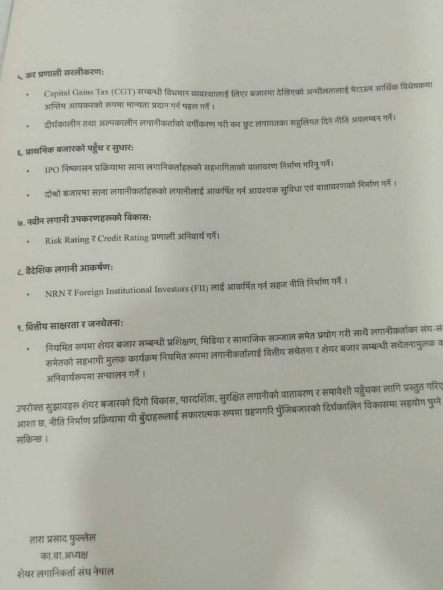 संघले प्रविधि र प्रणाली सुधार, नीति निर्माण र प्रतिनिधित्व, पारदर्शिता र सूचना प्रवाह, लगानीकर्ता संरक्षण, कर प्रणाली सरलीकरण, प्राथमिक बजारको पहूँच र सुधार, नवीन लगानी उपकरणहरुको विकास, वैदेशिक लगानी आकर्षण र वित्तीय साक्षरता र जनचेतना लगायत ९ बुँदे शीर्षकमा आफ्ना सुझावहरु बुझाएको छ ।