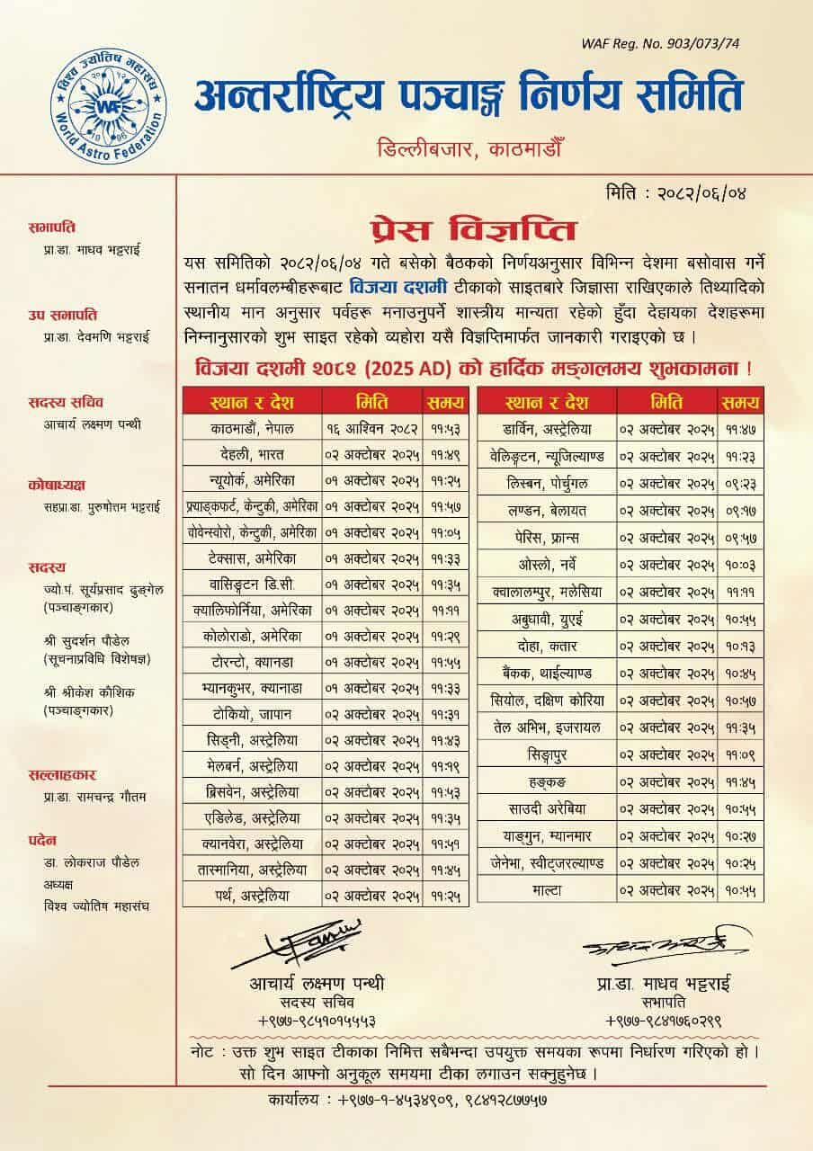 काठमाण्डौ । आज विजयादशमी पर्व धुमधामका साथ मनाइँदैछ। यस अवसरमा अन्तर्राष्ट्रिय पञ्चाङ्ग निर्णय समितिले विदेशमा बसोबास गर्ने सनातन धर्मावलम्बीहरूलाई लक्षित गर्दै टीकाको शुभ साइत सार्वजनिक गरेको छ।