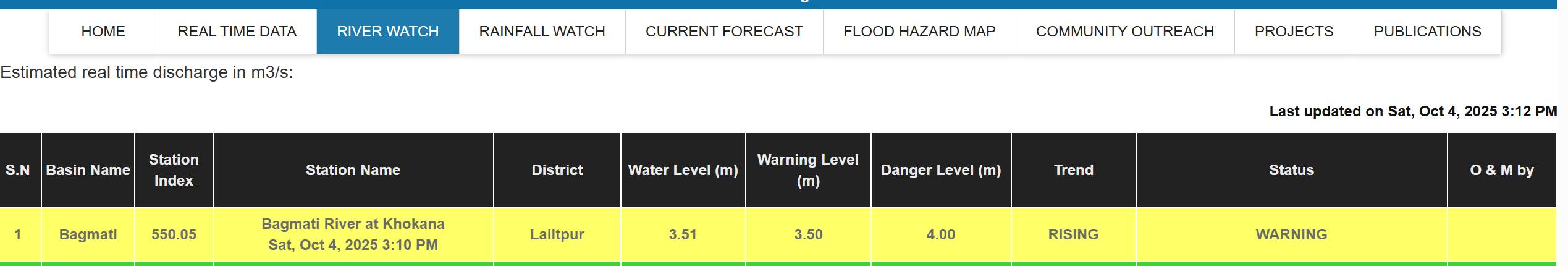 जल तथा मौसम विज्ञान विभागका अनुसार ललितपुर जिल्लास्थित बागमति नदी, खोकना जलमापन केन्द्रमा जलसतह सतर्कता तह पार गरेकोहो ।
