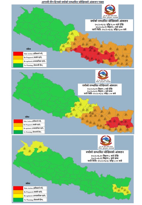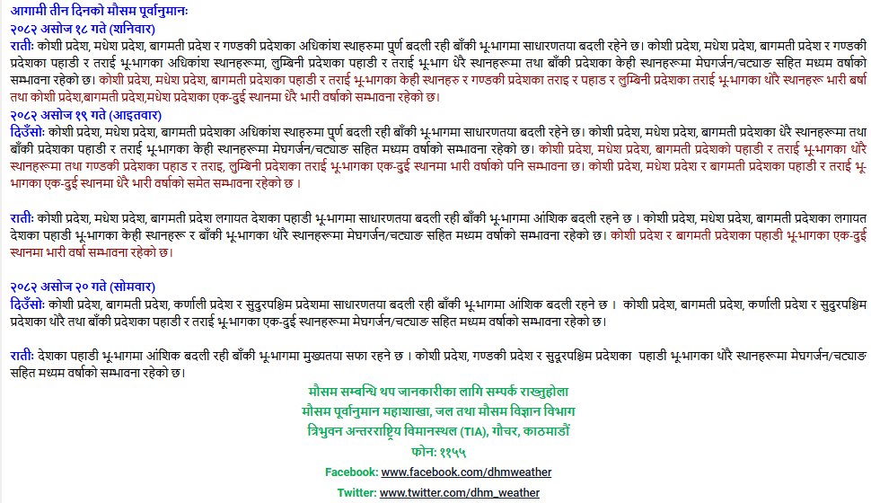 असोज १९ गते आइतबार(भोलि) दिउँसो कोशी, मधेश, बागमति प्रदेशको पहाडी र तराई भूभागमा थोरै स्थानहरुमा तथा गण्डकी प्रदेशका पहाड र तराई, लुम्बिनी प्रदेशका तराई भूभागका एकदुई स्थानमा भारी वर्षाको सम्भावना पनि रहेको छ ।