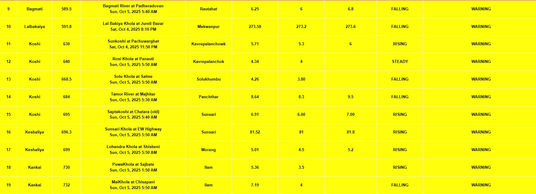 यस्तै, १२ वटा अन्य नदी केन्द्रहरूमा जलसतह सतर्कता तहभन्दा माथि पुगेको र अझै बढ्दो क्रममा रहेको विभागले जनाएको छ। यीमध्ये बागमती, कमला र कोसी जलाधारका बाढीमापन केन्द्रहरू प्रमुख हुन्। विभागले कोसी, मधेस र बागमती प्रदेशका धेरै नदी–नालाहरूमा बहाब सतर्कता तह नजिक पुगेको र कोसी प्रदेशमा बाढीको उच्च जोखिम कायम रहेको चेतावनी दिएको छ।