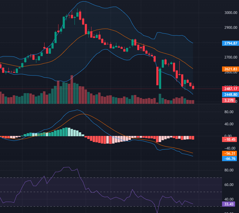 बोलिङ्गर ब्याण्डको आधारमा हाल बजार तल्लो विन्दुमा डाउन ट्रेन्डमा चलेको छ । म्याक्डीमा वियरिस क्रसओभर भ्यालिड नै रहेको छ । हिस्टोग्राम नेगेटिभ र लामा–लामा हुँदै गएका छन् । आरएसआई ओभर सोल्ड जोन ३३ को तहमा चलको छ । समग्रमा विभिन्न इन्डिकेटरबाट नियाल्दा बजार डाउन ट्रेन्डमा चलको देखिन्छ ।