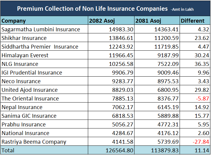 त्यस्तै, शिखरले १ अर्ब ३८ करोड, सिद्धार्थ प्रिमियरले १ अर्ब २२ करोड, हिमालयन एभरेष्टले १ अर्ब १९ करोड, एनएलजीले १ अर्ब २ करोड, आइजीआई प्रुडेन्सियलले ९९ करोड ६ लाख, नेकोले ९२ करोड ८३ लाख, युनाइटेड अजोडले ८८ करोड २९ लाख, नेपाल इन्स्योरेन्सले ७० करोड ६२ लाख, सानिमा जिआइसीले ६८ करोड १८ लाख, प्रभु इन्स्योरेन्सले ५० करोड ५६ लाख, नेशनल इन्स्योरेन्सले ४२ करोड ८४ लाख र राष्ट्रिय बीमा कम्पनीले ४१ करोड ४१ लाख रुपैयाँ प्रिमियम संकलन गरेको छ ।