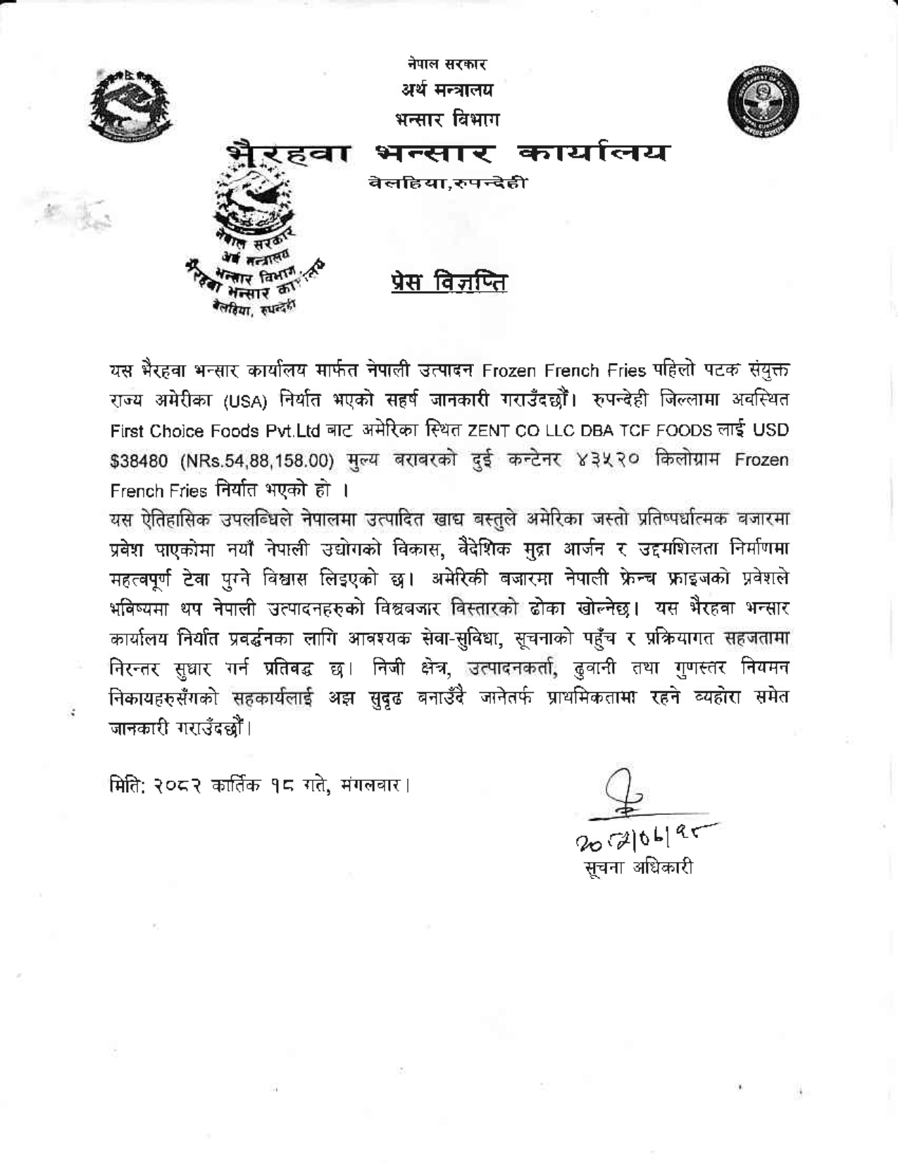 रुपन्देही जिल्लामा अवस्थित फ्रस्ट च्वाईस फूड्स प्रालिबाट अमेरिकास्थित ZENT CO LLC DBA TCF FOODS लाई अमेरिकी डलर ३८ हजार ४८०(नेरु. ५४ लाख ८८ हजार १५८) मूल्य बराबरको दुई कन्टेनर ४३५२० किलोग्राम फ्रोजन फ्रेञ्च फ्राइज निर्यात गरिएको हो ।