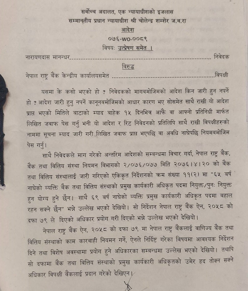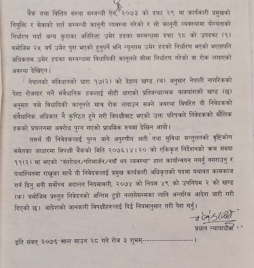 प्राइम कमर्सियल बैंकका तत्कालीन सीईओ नारायणदास मानन्धर, नबिल बैंकका तत्कालीन अध्यक्ष स्व. शम्भुप्रसाद पौडेललगायतको मुद्दामा सुनुवाइ गर्दै तत्काल उमेर हद लागू नगर्न र कानुन बनाएर मात्र लागू गर्न सर्वोच्च अदालतले अन्तरिम आदेश दिएको थियो ।