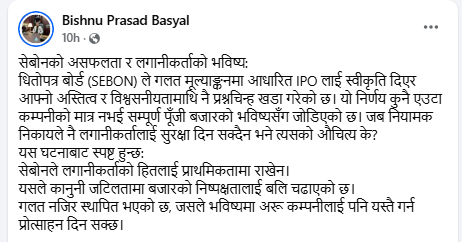 सेयर बजारमा निकै धेरैले फलो गर्ने प्राविधिक विश्लेषकको रुपमा चिनिएका बस्यालले आफ्नो धारणा सार्वजनिक गर्दै कम्पनीको नाम उल्लेख नगरी नियामकले लगानीकर्तालाई सुरक्षा दिन नसकेको भन्दै भूमिकामाथि पनि प्रश्न उठाएका छन् ।