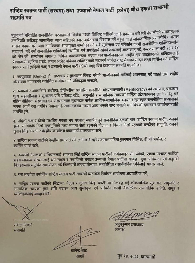 कुलमान संरक्षक रहेको दल, रवि लामिछाने र बालेनबीच भएको त्रिपक्षीय सहमति यस्तो छः