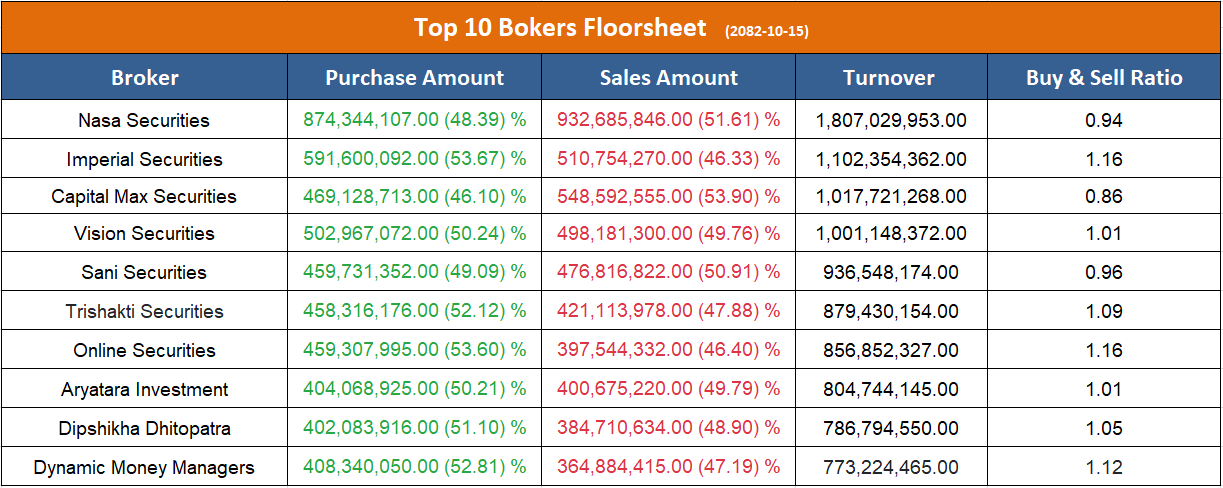 उच्च खरिद गर्ने ब्रोकरहरुमा इम्पेरियल सेक्युरिटिज, भिजन सेक्युरिटिज, अनलाइन सेक्युरिटिज, त्रिशक्ति सेक्युरिटिज, आर्यतारा इन्भेष्टमेन्ट एण्ड सेक्युरिटिज, दिपशिखा धितोपत्र कारोबार कम्पनी र डायनामिक मनि म्यानेजसइ रहेका छन् ।