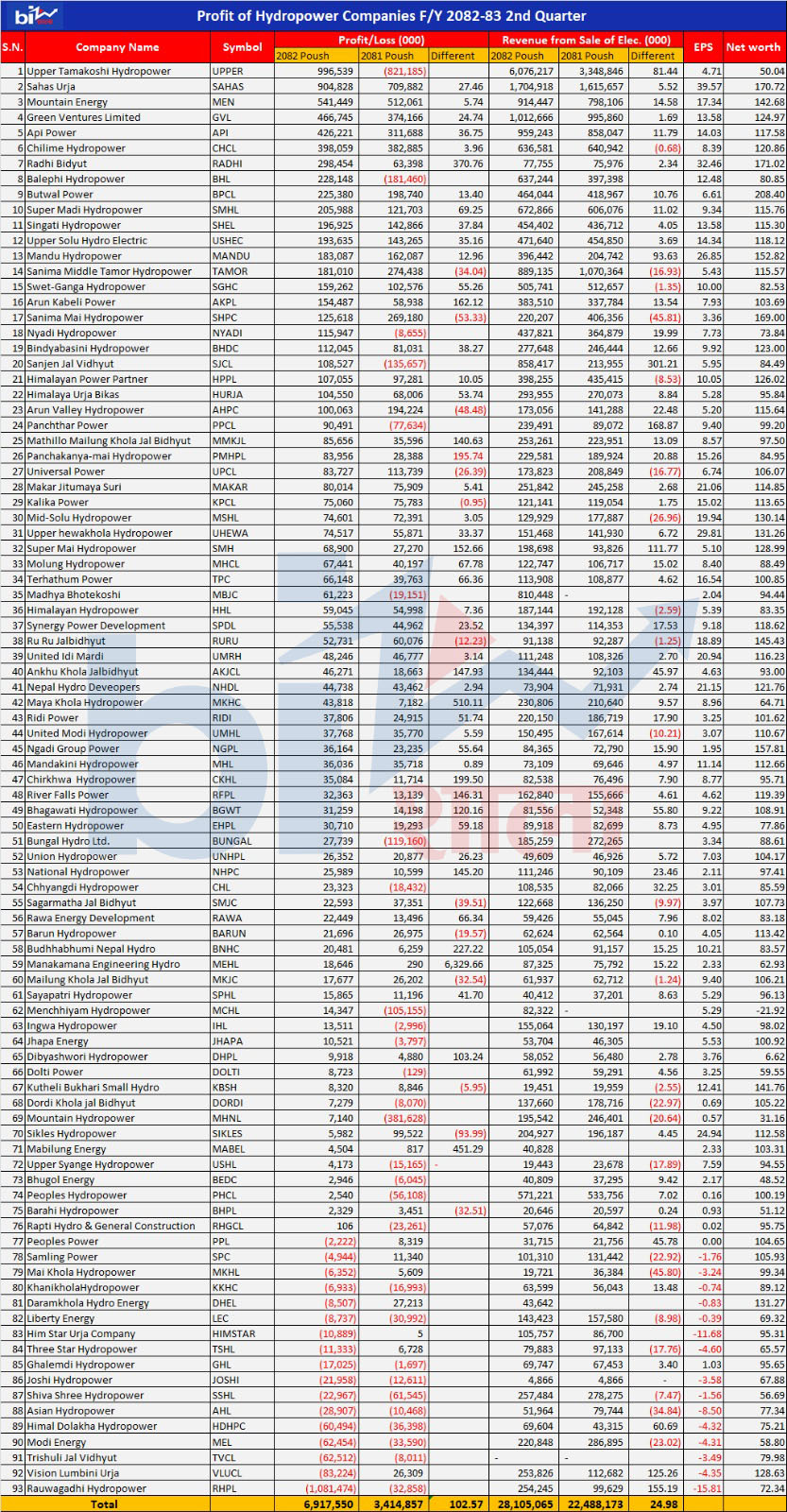 नाफामा उक्लिएका ७६ हाइड्रो कम्पनीले मात्रै दोस्रो त्रैमाससम्म ८ अर्ब ४१ करोड ८४ लाख रुपैयाँ नाफा कमाएका छन् । घाटा ब्यहोर्ने कम्पनीहरुको घाटा कुल नाफामा कटौती गर्दा समग्र हाइड्रो कम्पनीहरुले दोस्रो त्रैमाससम्म झण्डै ७ अर्ब जति नाफा कमाएका हुन् ।
