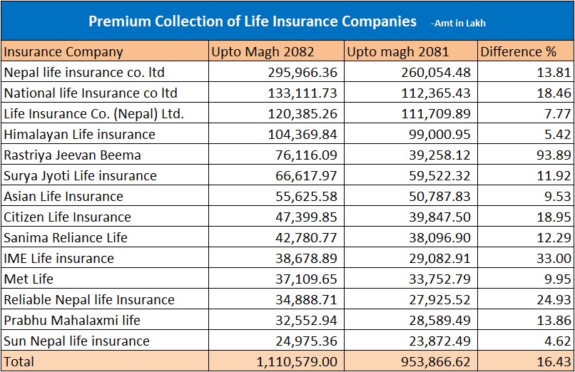 त्यस्तै, हिमालयन लाइफ इन्स्योरेन्सले १० अर्ब ४३ करोड रुपैयाँ, राष्ट्रिय जीवन बीमा कम्पनीले ७ अर्ब ६१ करोड, सूर्यज्योति लाइफ इन्स्योरेन्सले ६ अर्ब ६६ करोड रुपैयाँ, एशियन लाइफले ५ अर्ब ५६ करोड रुपैयाँ, सिटिजन लाइफले ४ अर्ब ७३ करोड रुपैयाँ, सानिमा रिलायन्स लाइफले ४ अर्ब २७ करोड र आइएमई लाइफले ३ अर्ब ८६ करोड रुपैयाँ बराबर प्रिमियम कलेक्सन गरेको छ ।