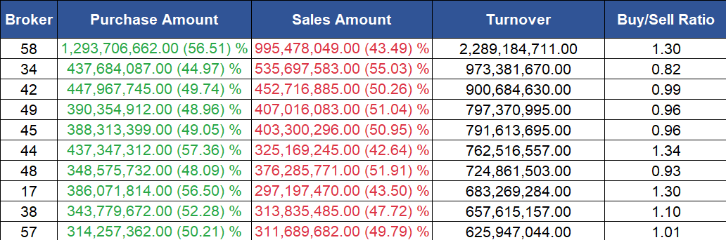 उच्च खरिद गर्ने ब्रोकरहरुमा नासा सेक्युरिटिज, डायनामिक मनि म्यानेजर्स, एबीसी सेक्युरिटिज, दिपशिखा धितोपत्र कारोबार कम्पनी र आर्यतारा इन्भेष्टमेन्ट एण्ड सेक्युरिटिज रहेका छन् ।