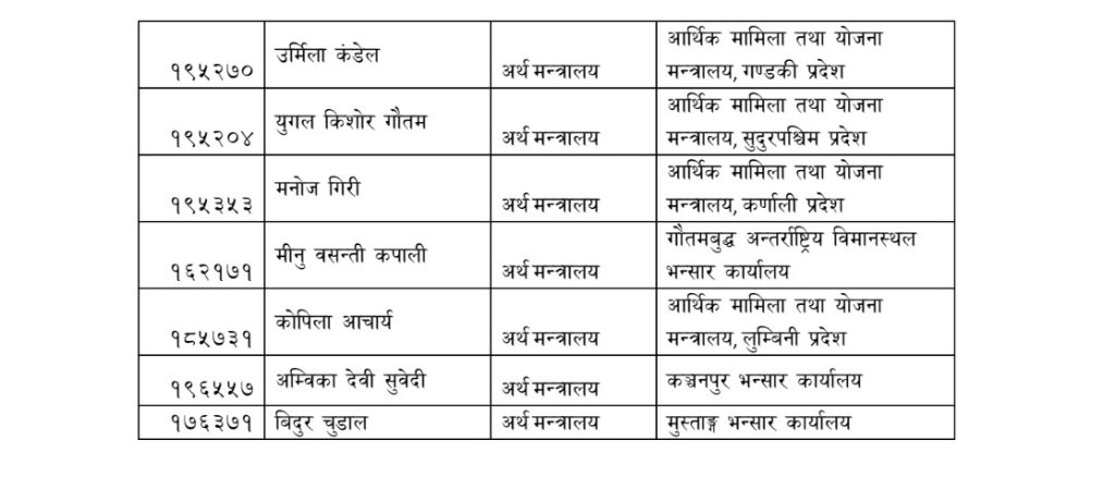 यससँगै केही उपसचिवलाई प्रदेशस्तरका आर्थिक मामिला तथा योजना मन्त्रालयहरूमा समेत जिम्मेवारी दिइएको जनाइएको छ। अर्थमन्त्री डा. स्वर्णिम वाग्लेले पदभार ग्रहण गरेपछि उपसचिव तहमा गरिएको यो पहिलो व्यापक सरुवा हो।