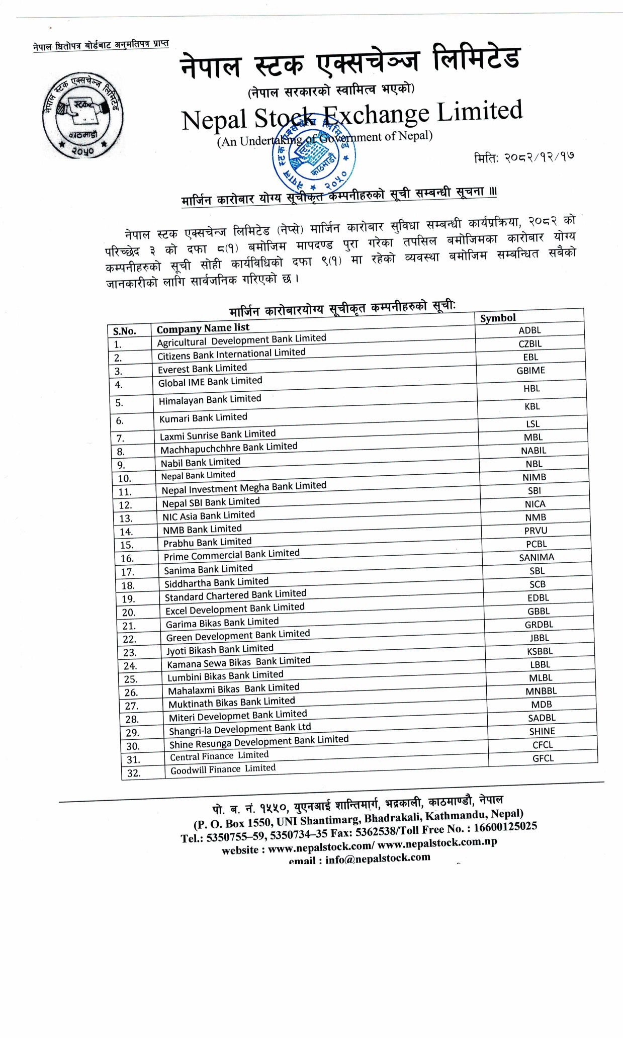 नेप्सेले मार्जिन कारोबार सुविधा सम्बन्धी कार्यप्रक्रिया २०८२ को परिच्छेद ३ को दफा ८(१) बमोजिम मापदण्ड पूरा गरेका कम्पनीहरुको सूचि सार्वजनिक गरिएको प्रष्टीकरण दिएको छ ।