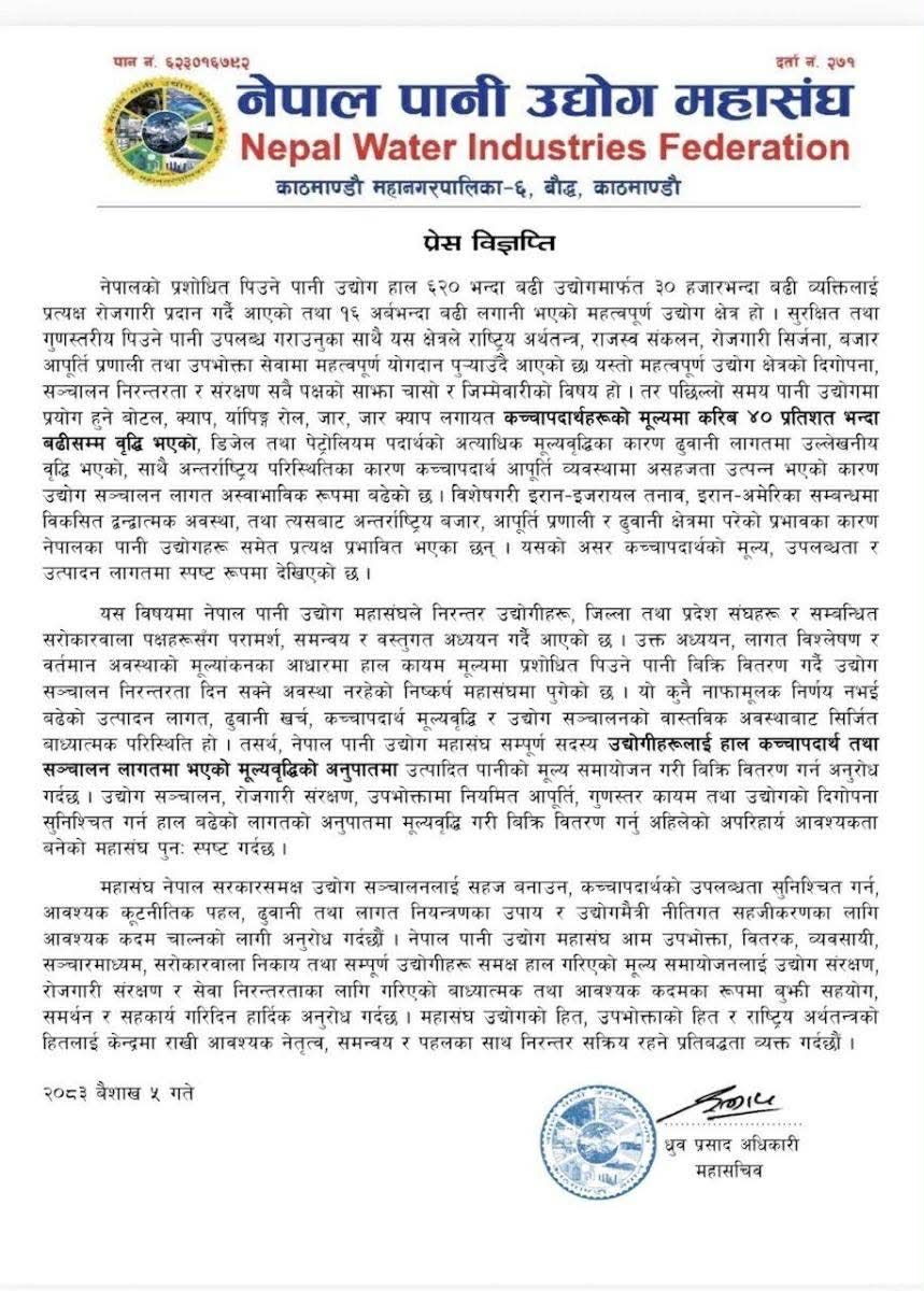 काठमाण्डौ । अन्तर्राष्ट्रिय स्तरमा बढ्दो तनावका कारण इन्धनको मूल्यमा आएको तीव्र वृद्धिले नेपाली उद्योग क्षेत्रलाई प्रत्यक्ष प्रभावित गर्न थालेको छ। यसको प्रभाव अब दैनिक उपभोग्य वस्तुमा समेत देखिन थालेको छ। नेपाल पानी उद्योग महासंघले बैशाख ५ गते जारी गरेको विज्ञप्तिमार्फत आफ्ना सदस्य उद्योगहरूलाई पिउने पानीको मूल्य एकैपटक करिब ४० प्रतिशतसम्म बढाउन सिफारिस गरेपछि बजारमा व्यापक तरंग सिर्जना भएको छ।