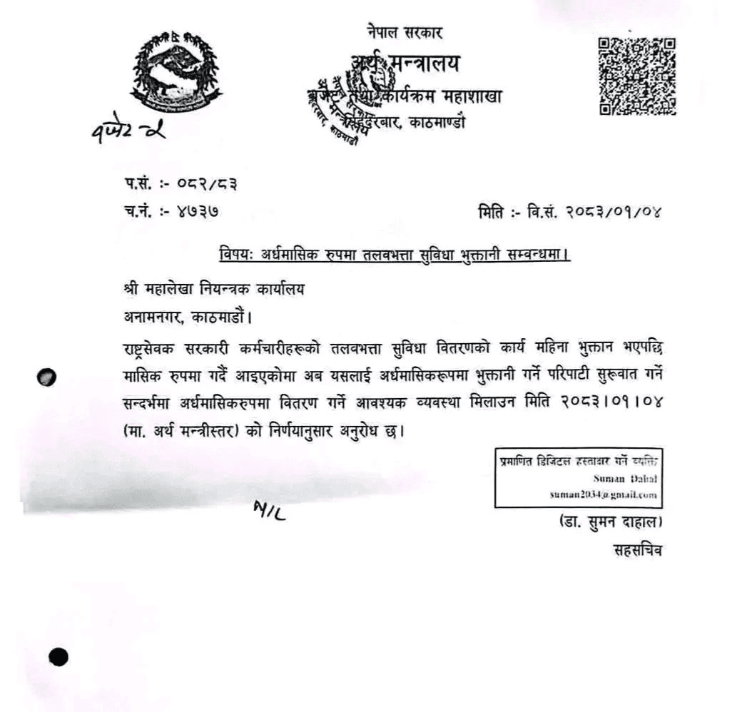 अर्थ मन्त्रालयले गत शुक्रबार मन्त्रीस्तरीय निर्णय गर्दै महालेखा नियन्त्रक कार्यालयलाई परिपत्र पठाइसकेको छ। यससँगै, हालसम्म महिनाको अन्त्यमा एकमुष्ट रूपमा दिइँदै आएको तलबभत्ता अब अर्धमासिक रूपमा वितरण हुने भएको हो।