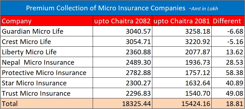 त्यस्तै, स्टार माइक्रो इन्स्योरेन्सले पनि ४०.८९ प्रतिशत बढाएर २३ करोड रुपैयाँ र ट्रस्ट माइक्रो इन्स्योरेन्सले ४९.०८ प्रतिशत बढाएर २२ करोड ९६ लाख रुपैयाँ बराबरको प्रिमियम संकलन गरेको छ ।