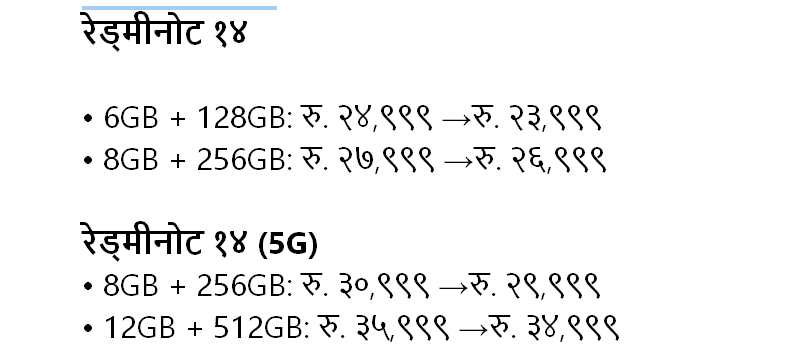 यस्तै उनले ग्राहकहरूका लागि रेड्मी नोट १४ सिरिजलाई अझ सुलभ बनाउने लक्ष्य पनि राखेका बताएका छन् । रेड्मी नोट १४ सिरिजको नयाँ मूल्य यस प्रकार छः