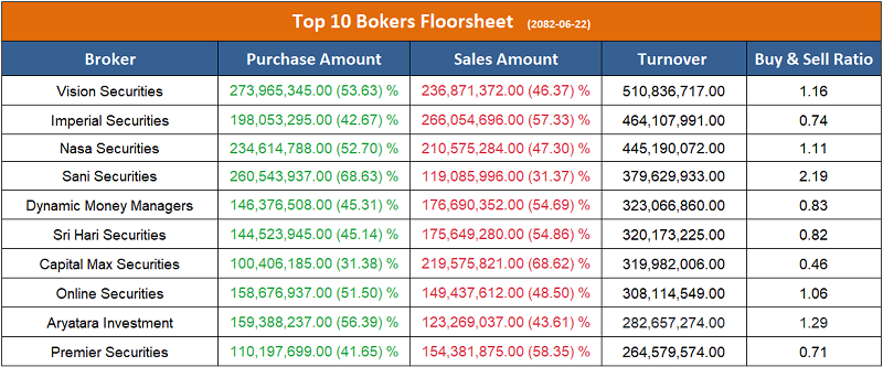 उच्च बिक्री गर्ने ब्रोकरहरुमा भिजन सेक्युरिटिज, नासा सेक्युरिटिज, सनि सेक्युरिटिज, अनलाइन सेक्युरिटिज र आर्यतारा इन्भेष्टमेन्ट एण्ड सेक्युरिटिज रहेका छन् ।
