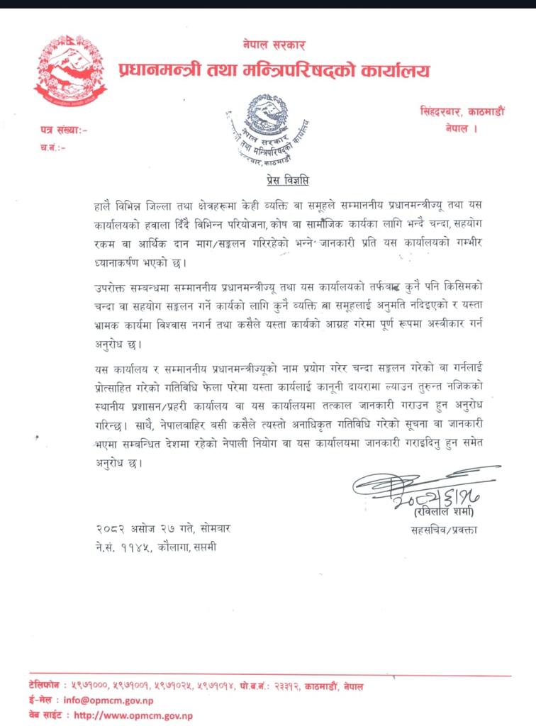 प्रम कार्यालयले प्रधानमन्त्रीको नाम प्रयोग गरेर चन्दा संकलन गरेको वा गर्नलाई प्रोत्साहित गरेको गतिविधि फेला परेमा यस्ता कार्यलाई कानूनी दायरामा ल्याउनका लागि तुरुन्तै नजिकको स्थानीय प्रशासन वा प्रहरी कार्यालय वा प्रम कार्यालयमा तत्काल जानकारी गराउन समेत अपील गरेको छ ।