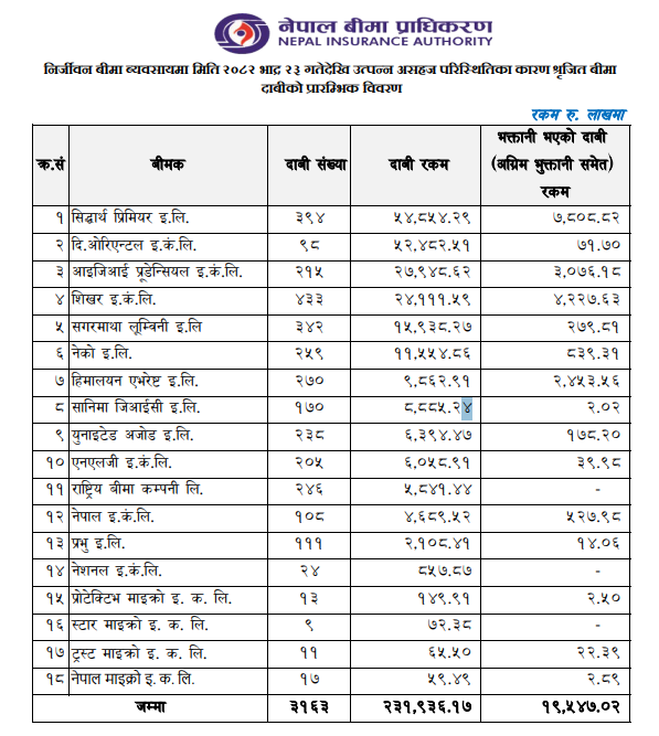 त्यस्तै, शिखर इन्स्योरेन्समा ४३३ वटा बीमाको २ अर्ब ४१ करोड ११ लाख रुपैयाँ, सगरमाथा लुम्बिनीमा ३४२ वटा बीमाको १ अर्ब ५९ करोड ३८ लाख रुपैयाँ बराबरको दाबी परेको छ । जसमा शिखरले ४२ करोड २७ लाख र सगरमाथा लुम्बिनीले २ करोड ७९ लाख रुपैयाँ भुक्तानी दिइसकेको छ ।