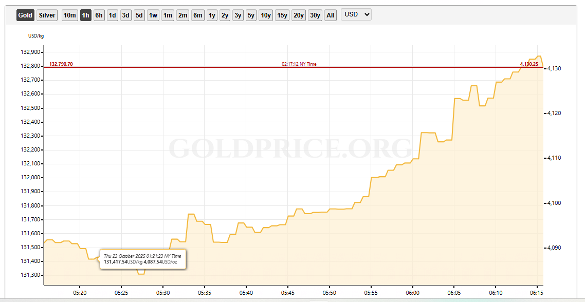 पछिल्लो केही घण्टामा सुनको मूल्यमा २ प्रतिशतको बढोत्तरीसहित ट्राय औंस(२८.३४९५ ग्राम)को मूल्य ४१३० डलरभन्दा माथि पुगेको हो।