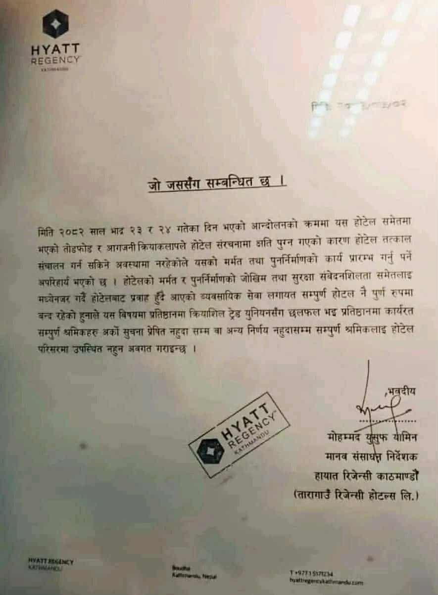 हायात रिजेन्सी काठमाण्डौका मानव संसाधन निर्देशक मोहम्मद युसुफ यामिनले एक सूचना प्रकाशित गर्दै आन्दोलनका क्रममा भएको क्षति र सुरक्षाजन्य संवेदनशीलताका कारण होटल तत्काल सञ्चालन गर्न नसकिने भनिएको छ ।