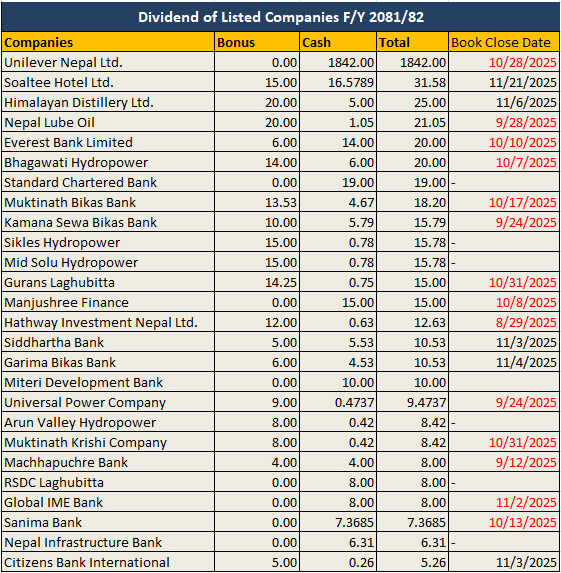 ७ वाणिज्य बैंकसहित हालसम्म २६ कम्पनीले गरे लाभांश घोषणा, १२ को बुकक्लोज हुन बाँकी