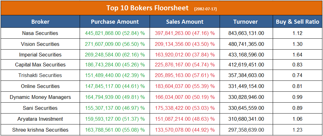 उच्च खरिद गर्ने ब्रोकरहरुमा नासा सेक्युरिटिज, भिजन सेक्युरिटिज, इम्पेरियल सेक्युरिटिज, आर्यतारा इन्भेष्टमेन्ट एण्ड सेक्युरिटिज र श्रीकृष्ण सेक्युरिटिज रहेका छन् ।