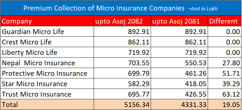 त्यस्तै, निर्जीवन लघुबीमा कम्पनीहरुले पहिलो त्रैमाससम्म २६ करोड ८१ लाख रुपैयाँ प्रिमिमय संकलन गरेका छन् । सर्वाधिक नेपाल माइक्रो इन्स्योरेन्सले ७ करोड ३ लाख, प्रोटेक्टिभ माइक्रो इन्स्योरेन्सले ६ करोड ९९ लाख, स्टार माइक्रो इन्स्योरेन्सले ५ करोड ८२ लाख र ट्रस्ट माइक्रो इन्स्योरेन्सले ६ करोड ९५ लाख रुपैयाँ प्रिमिमय संकलन गरेका छन् ।
