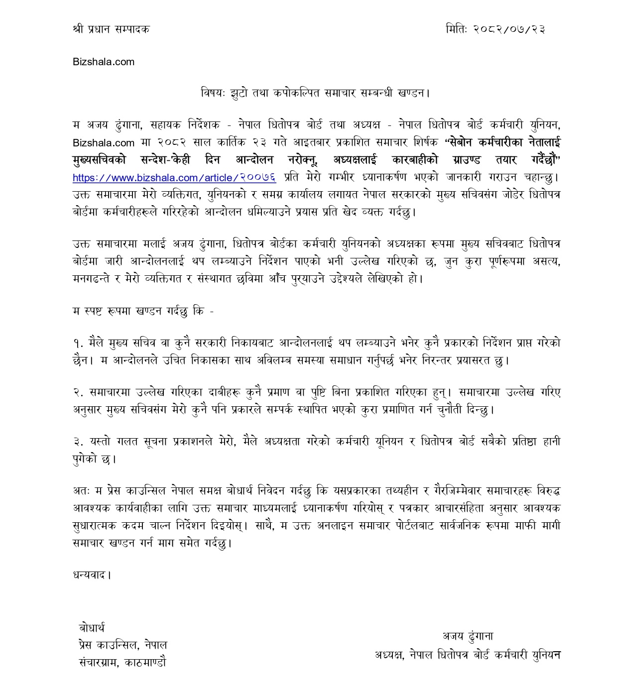 बिजशालामा प्रकाशित सेबोन कर्मचारीका नेतालाई मुख्यसचिवको सन्देशः केही दिन आन्दोलन नरोक्नू, अध्यक्षलाई कारबाहीको ग्राउण्ड तयार गर्दैछौं भन्ने समाचारप्रति आफ्नो गम्भीर ध्यानाकर्षण भएको भन्दै उनले बिजशालालाई आइतबार राति एउटा खण्डन पठाउँदै त्यस्तो दाबी गरेका हुन् ।