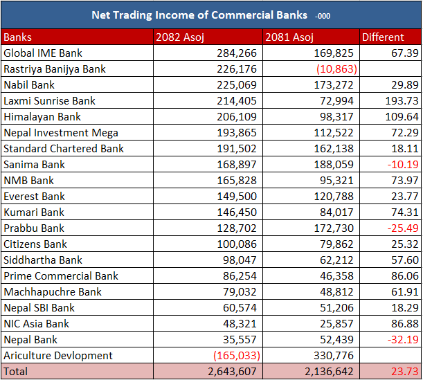 सो अवधिसम्म कृषि विकास बैंकको यस्तो आम्दानी ऋणात्मक रहेको छ भने सबै बैंकको धनात्मक रहेको छ । गत आवको तुलनामा तीन बैंकको यस्तो आम्दानी घटेको छ भने बाँकी सबैको उल्लेख्य बढेको छ ।
