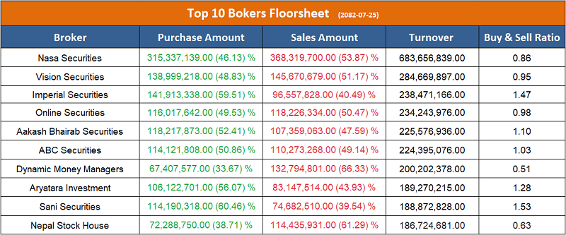 त्यस्तै, उच्च बिक्री गर्ने ब्रोकरहरुमा नासा सेक्युरिटिज, भिजन सेक्युरिटिज, अनलाइन सेक्युरिटिज, डायनानिमक मनि म्यानेजर्स र नेपाल स्टक हाउस रहेका छन् ।