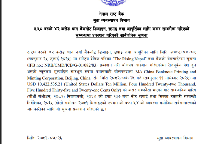 राष्ट्र बैंकको मुद्रा व्यवस्थापन विभागका अनुसार, बोलपत्र र सम्झौता प्रक्रिया सार्वजनिक खरिद नियमावली, २०८० र सार्वजनिक खरिद कार्यविधि, २०८१ बमोजिम गरिएको हो।