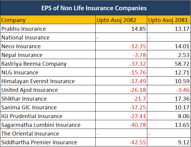 बीमा कम्पनीहरुको मुनाफामा ठूलो गिरावट देखिएसँगै प्रतिसेयर आम्दानी (इपीएस)मा समेत प्रभाव देखिएको छ । सो अवधिसम्म प्रभु इन्स्योरेन्स बाहेक सबै कम्पनीको इपीएस ऋणात्मक देखिएको छ । प्रभु इन्स्योरेन्सको इपीएस १४.८५ रुपैयाँ रहेको छ ।