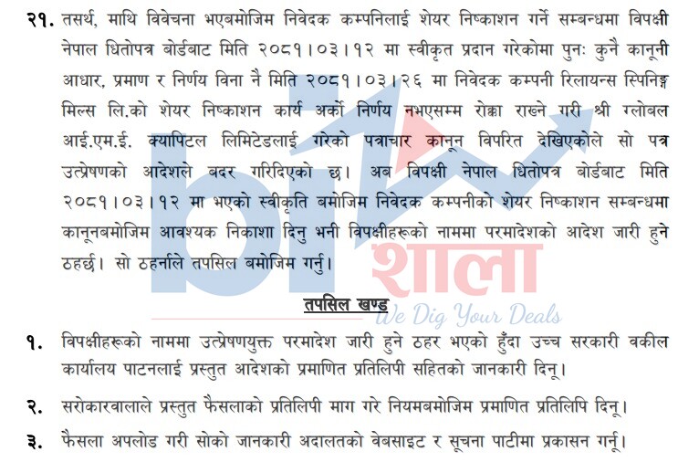 अदालतले दिएको आदेशको पूर्ण पाठमा के भनिएको छ त ? हामीलाई प्राप्त उच्च अदालत पाटनका न्यायाधीशद्वय राजुकुमार खतिवडा र सूर्यप्रसाद रिजालको संयुक्त इजलासले नेपाल धितोपत्र बोर्डबाट २०८१ असार १२ मा स्वीकृत प्रदान गरेकोमा पुनः कुनै कानूनी आधार, प्रमाण र निर्णयबिना नै २०८१ असार २६ गते निवेदक कम्पनी रिलान्यस स्पिनिङ मिल्स लिमीटेडको सेयर निश्कासन कार्य अर्को निर्णय नभएसम्म रोक्का राख्ने गरी ग्लोबल आईएमई क्यापिटल लिमीटेडलाई गरेको पत्राचार कानूनविपरीत देखिएकोले सो पत्र उत्प्रेषणको आदेशले बदर गरिएको भनिएको छ । आदेशमा अगाडि लेखिएको छः 'अब विपक्षी नेपाल धितोपत्र बोर्डबाट मिति २०८१/०३/१२ मा भएको स्वीकृतिबमोजिम निवेदक कम्पनीको सेयर निश्कासन सम्बन्धमा कानूनबमोजिम आवश्यक निकासा दिनु भनी विपक्षीहरुको नाममा परमादेशको आदेश जारी हुने ठहर्छ ।'