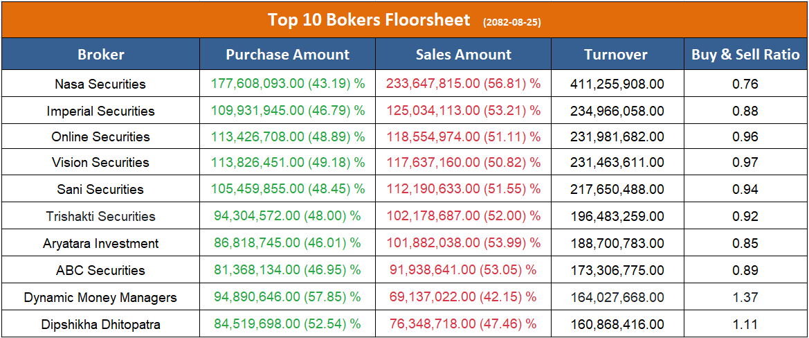 त्यस्तै, उच्च बिक्री गर्ने ब्रोकरहरुमा नासा सेक्युरिटिज, इम्पेरियल सेक्युरिटिज, अनलाइन सेक्युरिटिज, भिजन सेक्युरिटिज, सनि सेक्युरिटिज, त्रिशक्ति सेक्युरिटिज, आर्यतारा इन्भेष्टमेन्ट एण्ड सेक्युरिटिज र एबीसी सेक्युरिटिज रहेका छन् ।