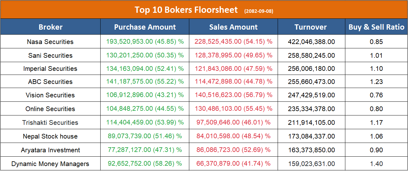 त्यस्तै, उच्च बिक्री गर्ने ब्रोकरहरुमा नासा सेक्युरिटिज, भिजन सेक्युरिटिज, अनलाइन सेक्युरिटिज र आर्यतारा इन्भेष्टमेन्ट एण्ड सेक्युरिटिज रहेका छन् ।