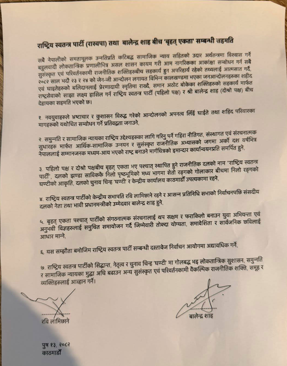 सहमति अनुसार पार्टीको केन्द्रीय नेतृत्व रवि लामिछानेकै जिम्मामा रहनेछ भने बालेनले रास्वपाको नाम, चुनाव चिह्न र नेतृत्व स्वीकार गर्दै सहकार्यमा अघि बढ्नेछन्। फागुन २१ मा हुने निर्वाचनपछि संसदीय दलको नेता तथा भावी प्रधानमन्त्रीका उम्मेदवारका रूपमा बालेन्द्र शाहलाई अघि सार्ने सहमति पत्रमा उल्लेख छ।