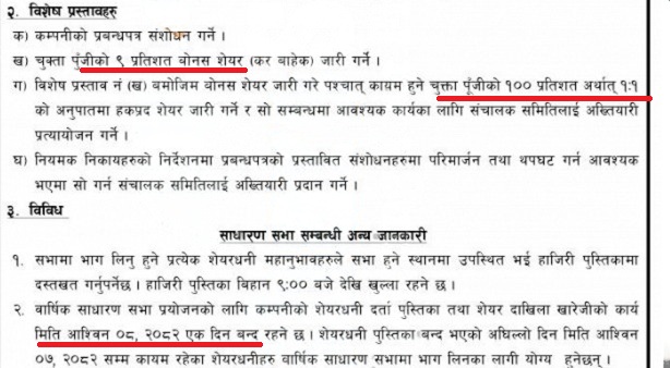 कम्पनीले २०८२ भदौ ३० गते एक सूचना प्रकाशित गरी आर्थिक वर्ष  २०७९/८०, २०८०/०८१, ०८१/८२ को आर्थिक वर्ष एकैपटक २०८२ असोज २३ गते गर्ने निर्णय गरेको थियो ।