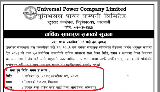 प्रसङ्ग हो, युनिभर्सल पावर कम्पनी लिमीटेडको । दोश्रो बजारमा यूपीसिएल कोडबाट कारोबार हुने गरेको यो कम्पनी त्यसै पनि समयमा वार्षिक साधारणसभा नगर्ने खराब परिचय बनाएको कम्पनी हो । यो कम्पनीले विगत तीन वर्षदेखि लगातार एजीएम गरेको थिएन ।