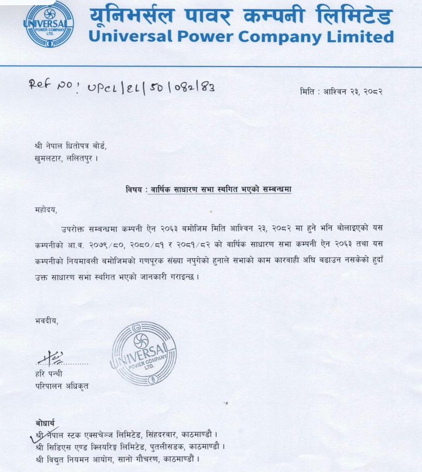 सो साधारणसभा प्रयोजनका लागि कम्पनीले असोज ८ गते एकदिन बुक क्लोज पनि गरेको थियो । तर सबै तयारी पूरा गरेर साधारणसभा आयोजना गरिए पनि कम्पनीले एकाएक असोज २३ गते नै नेपाल धितोपत्र बोर्डलाई एक पत्र र त्यसको बोधार्थ नेप्से तथा विद्युत नियमन आयोगलाई समेत पठाउँदै गणपुरक संख्या नपुगेका कारण साधारणसभा स्थगित भएको जानकारी गराएको थियो ।