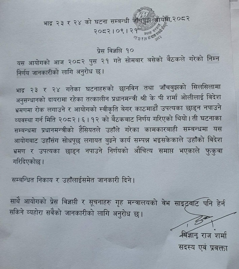 काठमाण्डौ । गत भदौ २३ र २४ गते भएको जेनजी आन्दोलनको घटनासम्बन्धी जाँचबुझ आयोगले नेकपा एमालेका अध्यक्ष तथा तत्कालीन प्रधानमन्त्री केपी शर्मा ओलीमाथि लगाइएको विदेश भ्रमण तथा काठमाण्डौ उपत्यका बाहिर जान नपाउने प्रतिबन्ध फुकुवा गर्ने निर्णय गरेको छ।