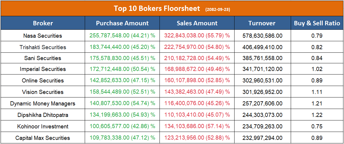 त्यस्तै, उच्च बिक्री गर्ने ब्रोकरहरुमा नासा सेक्युरिटिज, त्रिशक्ति सेक्युरिटिज, सनि सेक्युरिटिज, अनलाइन सेक्युरिटिज, कोहीनुर इन्भेष्टमेन्ट एण्ड सेक्युरिटिज र क्यापिटल म्याक्स सेक्युरिटिज रहेका छन् ।
